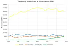 The electricity sector in France is dominated by its nuclear power, which accounted for 71.7% of total production in 2018, while renewables and fossil fuels accounted for 21.3% and 7.1%, respectively[1] (compare to 72.3% nuclear, 17.8% renewables and 8.6% fossil fuels in 2016).[2] France has the largest share of nuclear electricity in the world, and together with renewable energy supplies, this has helped its grid achieve very low carbon intensity.