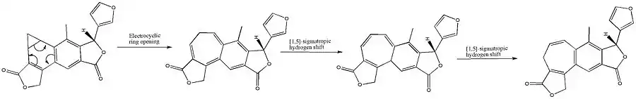The benzonorcaradiene diterpenoid (A) was rearranged into the benzocycloheptatriene diterpenoid isosalvipuberlin (B) by boiling a methylene chloride solution. This transformation can be envisaged as a disrotatory electrocyclic reaction, followed by two suprafacial 1,5-sigmatropic hydrogen shifts, as shown below.[6]