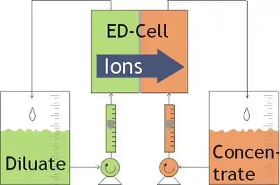 Electrodialysis (ED) is used to transport salt ions from one solution through ion-exchange membranes to another solution under the influence of an applied electric potential difference. This is done in a configuration called an electrodialysis cell. The cell consists of a feed (dilute) compartment and a concentrate (brine) compartment formed by an anion exchange membrane and a cation exchange membrane placed between two electrodes. In almost all practical electrodialysis processes, multiple electrodialysis cells are arranged into a configuration called an electrodialysis stack, with alternating anion and cation-exchange membranes forming the multiple electrodialysis cells. Electrodialysis processes are different from distillation techniques and other membrane based processes (such as reverse osmosis (RO)) in that dissolved species are moved away from the feed stream rather than the reverse. Because the quantity of dissolved species in the feed stream is far less than that of the fluid, electrodialysis offers the practical advantage of much higher feed recovery in many applications.[1][2][3][4][5][6][7]