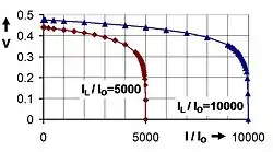 When driving a load, the photo voltage is variable. As shown in the figure, for a load resistance RL, the cell develops a voltage that is between the short-circuit value V = 0, I = IL and the open-circuit value Voc, I = 0, a value given by Ohm's law V = I RL, where the current I is the difference between the short-circuit current and current due to forward bias of the junction, as indicated by the equivalent circuit[51] (neglecting the parasitic resistances).[52]