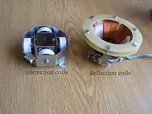For proper functioning of the electron gun, it is necessary that the beam be perfectly adjusted with respect to the optical axes of the accelerating electrical lens and the magnetic focusing lens. This can be done by applying a magnetic field of some specific radial direction and strength perpendicular to the optical axis before the focusing lens. This is usually realized by a simple correction system consisting of two pairs of coils. By adjusting the currents in these coils any required correcting field can be produced.