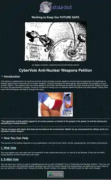 The first known use of the term CyberVote was by Midac Technologies in 1995 when they ran a web based vote regarding the French nuclear testing in the Pacific region. The resulting petition was delivered to the French government on a Syquest removable hard disk.[16]