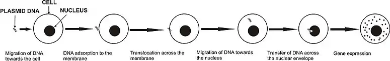 Application of electric pulses of sufficient strength to the cell causes an increase in the trans-membrane potential difference, which provokes the membrane destabilization. Cell membrane permeability is increased and otherwise nonpermeant molecules enter the cell.[49][50] Although the mechanisms of gene electrotransfer are not yet fully understood, it was shown that the introduction of DNA only occurs in the part of the membrane facing the cathode and that several steps are needed for successful transfection: electrophoretic migration of DNA towards the cell, DNA insertion into the membrane, translocation across the membrane, migration of DNA towards the nucleus, transfer of DNA across the nuclear envelope and finally gene expression.[51] There are a number of factors that can influence the efficiency of gene electrotransfer, such as: temperature, parameters of electric pulses, DNA concentration, electroporation buffer used, cell size and the ability of cells to express transfected genes.[52] In in vivo gene electrotransfer, DNA diffusion through extracellular matrix, properties of tissue and overall tissue conductivity are also crucial.[53]