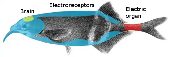 In active electrolocation,[12] the animal senses its surrounding environment by generating weak electric fields (electrogenesis) and detecting distortions in these fields using electroreceptor organs. This electric field is generated by means of a specialised electric organ consisting of modified muscle or nerves.[13] Animals that use active electroreception include the weakly electric fish, which either generate small electrical pulses (termed "pulse-type"), as in the Mormyridae, or produce a quasi-sinusoidal discharge from the electric organ (termed "wave-type"), as in the Gymnotidae.[14] These fish create a potential usually smaller than one volt (1 V). Weakly electric fish can discriminate between objects with different resistance and capacitance values, which may help in identifying objects. Active electroreception typically has a range of about one body length, though objects with an electrical impedance similar to that of the surrounding water are nearly undetectable.