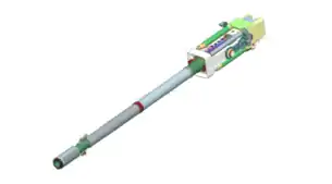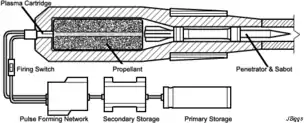 ETC is also a more viable option than other alternatives by definition. ETC requires much less energy input from outside sources, like a battery, than a railgun or a coilgun would. Tests have shown that energy output by the propellant is higher than energy input from outside sources on ETC guns.[19] In comparison, a railgun currently cannot achieve a higher muzzle velocity than the amount of energy input. Even at 50% efficiency a rail gun launching a projectile with a kinetic energy of 20 MJ would require an energy input into the rails of 40 MJ, and 50% efficiency has not yet been achieved.[20] To put this into perspective, a rail gun launching at 9 MJ of energy would need roughly 32 MJ worth of energy from capacitors. Current advances in energy storage allow for energy densities as high as 2.5 MJ/dm³, which means that a battery delivering 32 MJ of energy would require a volume of 12.8 dm³ per shot; this is not a viable volume for use in a modern main battle tank, especially one designed to be lighter than existing models.[21] There has even been discussion about eliminating the necessity for an outside electrical source in ETC ignition by initiating the plasma cartridge through a small explosive force.[22]