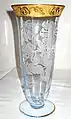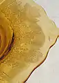 Elegant glass was at least partially hand made during production.[2] Elegant glass manufacturers produced vibrant colors that varied far more than Depression Glass.[1] Shades of red, blue, green, amber, yellow, smoke, amethyst, and pink were produced. An easy way to compare the difference in color quality is to take a look at a piece of cobalt Elegant glass and place it alongside a piece of cobalt Depression Glass. The intensity of the former piece is quite evident. Pressed Elegant glass was fire polished to get rid of the flaws in the glass. The normal flaws found in pressed glass – straw marks, raised seams, etc. were removed. The base of bowls, platters, etc. was ground so it would sit evenly on a table. Many patterns of Elegant glass were embellished with acid etching, cutting, enamel decoration, gold encrustation, platinum and gold trim.[1]