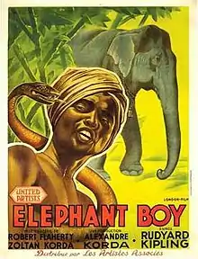 Elephant Boy is a 1937 British adventure film starring Sabu in his film debut.[1] Documentary filmmaker Robert J. Flaherty, who produced some of the Indian footage, and supervising director Zoltan Korda, who completed the film, won the Best Director Award at the Venice Film Festival. The film was made at the London Films studios at Denham, and in Mysore, India, and is based on the story "Toomai of the Elephants" from Rudyard Kipling's The Jungle Book (1894).[2]