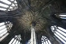 In June 1390, Alexander Stewart, Robert III's brother, burned the cathedral, manses and burgh of Elgin. This fire was very destructive, requiring the central tower to be completely rebuilt along with the principal arcades of the nave. The entire western gable between the towers was reconstructed and the main west doorway and chapter house were refashioned.[100] The internal stonework of the entrance is late 14th or early 15th century and is intricately carved with branches, vines, acorns and oak leaves.[96] A large pointed arch opening in the gable immediately above the main door contained a series of windows, the uppermost of which was a circular or rose window dating from between 1422 and 1435. Just above it can be seen three coats of arms: on the right is that of the bishopric of Moray, in the middle are the Royal Arms of Scotland, and on the left is the armorial shield of Bishop Columba Dunbar (Fig. 11).[96] The walls of the nave are now very low or even at foundation level, except one section in the south wall which is near its original height. This section has windows that appear to have been built in the 15th-century to replace the 13th-century openings: they may have been constructed following the 1390 attack (Fig. 12).[101] Nothing of the elevated structure of the nave remains, but its appearance can be deduced from the scarring seen where it attached to the eastern walls of the towers. Nothing of the crossing now remains following the collapse of the central tower in 1711.[99] Elgin Cathedral is unique in Scotland in having an English-style octagonal chapter house and French-influenced double aisles along each side of the nave; in England, only Chichester Cathedral has similar aisles.[102][103] The chapter house, which had been attached to the choir through a short vaulted vestry, required substantial modifications and was now provided with a vaulted roof supported by a single pillar (Figs. 13 & 14). The chapter house measures 10.3 metres (34 ft) high at its apex and 11.3 metres (37 ft) from wall to opposite wall; it was substantially rebuilt by Bishop Andrew Stewart (1482–1501), whose coat of arms is placed on the central pillar.[67] Bishop Andrew was the half-brother of King James II.[104] The delay in the completion of these repairs until this bishop's episcopacy demonstrates the extent of the damage from the 1390 attack.[105]