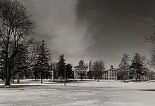 Prior to 1894, many physically ill patients were denied admission to the state hospitals as being too infirm to benefit from care and were kept in local almshouses. However, changes in Illinois laws required that they be treated by the state hospitals. As a result, in 1894, Wing Hall opened as a detached infirmary building, bringing the total hospital capacity to 1,107 beds.[7] In 1910, a 110-bed infirmary for female patients opened in an addition to the north end of the Center Building called "D-North" bringing the bed capacity to 1,210. These buildings were replaced in 1921 with the construction of a new general hospital located between the Central Building and the Annex.[8] In 1967, the general hospital was replaced by a new Medical and Surgical Building.[9] The new circular building was designed by Bertrand Goldberg, who also designed Marina City in Chicago.[10]