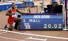 Elijah Hall-Thompson (born August 22, 1994) is an American track and field sprinter and American record holder in the indoor 200 meters.[6][5][4] At the NCAA Division I Championships he helped the Houston Cougars win and set the collegiate record in the 4 × 100 meters relay in 2018, and won both the 60 meters and the 200 meters at the NCAA Division I Indoor Championships in 2018.[7][4] His winning time of 20.02 seconds in the 200 meters is the second fastest time ever achieved over the distance indoors.