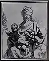 Sirani's style is close to that of her father's teacher, Guido Reni, but Elisabetta employed more dramatic contrasts of light and shade, virtuoso brushstrokes, and more brilliant color.[27] More similarities of her works may be found in the draftsmanship of Ludovico Carracci, Giovanni Francesco Barbieri (Guercino), and Simone Cantarini (Bohn). Her striking images of female heroines, such as Portia Wounding Her Thigh are comparable to the work of Artemisia Gentileschi. Sirani often selected lesser-known subjects for her paintings and her unique interpretation of iconography drew praise from a number of contemporaries.[23] “Sirani made drawings in a variety of media, such as brush and wash, pen and ink with wash, black chalk, red chalk, and a combination of the two.”[20] Her drawings, while done in many different media, usually in pen or brush and ink, display the same brilliance as her paintings, often quickly executed with what Malvasia describes as "nonchalance."[28]