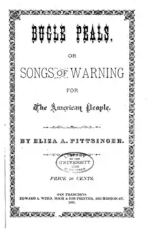 This article incorporates text from this source, which is in the public domain: Pittsinger, Eliza A. (1882). Bugle Peals, Or Songs of Warning for the America People (Public domain ed.). E: A. Weed Press.