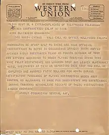 Chambers trained at Avenger Field in Sweetwater, Texas, and then was sent to Turner Field in Albany, Georgia. She then attended the Army Air Force Tactical School in Orlando, Florida.[2][3] Chambers was stationed at Greenwood Army Air Field in Greenwood, Mississippi.[15] At Greenwood, Chambers accrued over 420 hours of flight time up until December 20, 1944.[16]