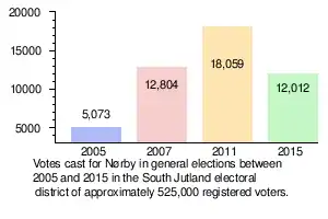 She stood for election to the national parliament in 2005. Venstre had been in power as the largest party in a coalition government since 2001, and although their support slipped in 2005 they remained the largest party. Nørby won 5,073 votes which was enough to secure her a seat in parliament. She became her party's spokesperson for culture and the arts. Support for Venstre slipped again in 2007, but they were still, by a small margin, the largest party. Nørby's own support increased to 12,804 votes in her South Jutland electoral district. In this parliamentary session her focus was on social issues and gender equality. Her vote level increased again in 2011, this time to 18,059 votes. This was the highest number of votes received by any of the Venstre candidates in 2011.[5] Her 12,012 votes in the 2015 election were again comfortably more than were won by most (if, this time, not quite all) of her fellow Venstre candidates.[6] Between 2006 and her first ministerial appointment, in 2015, Ellen Trane Nørby was her party's spokesperson on "new media" questions.
