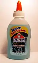 Immediately after World War II, the company expanded into synthetic resin glues and, in 1947, the first multipurpose consumer white glue, known as Elmer's Glue-All, was introduced.[5] The glue was packaged in a glass bottle with a Popsicle stick type wooden applicator attached with a rubber band. Consumer feedback confirmed a need for an easier to use delivery method, which prompted the company to develop easy to squeeze bottles featuring a twistable orange cap, introduced in 1962. This innovation remains in use and is a trademark of Elmer's Products.[6]
