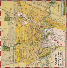 The area was named for the Elmwood Cemetery, which opened in 1902. Prior to this, the area was known as the Louise Bridge District or Kildonan Village.[1] Elmwood is bordered by the lane between Harbison and Larsen Avenues (extended) on the North, Panet Road on the East, Thomas and Tyne Avenues and the Canadian Pacific mainline on the South, and the Red River on the west.