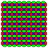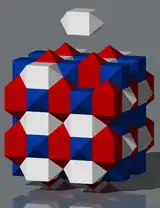 It can be considered a transitional phase between the cubic and rhombic dodecahedral honeycombs.[1] The cells are here colored white, red, and blue based on their orientation in space. The square pyramid caps have shortened isosceles triangle faces, with six of these pyramids meeting together to form a cube. The dual of this honeycomb is composed of two kinds of octahedra (regular octahedra and triangular antiprisms), formed by superimposing octahedra into the cuboctahedra of the rectified cubic honeycomb. Both honeycombs have a symmetry of [[4,3,4]].