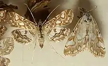 Elophila nymphaeata, the brown china mark, is a species of moth of the family Crambidae. It was described by Carl Linnaeus in his 1758 10th edition of Systema Naturae. It is found in Europe an across the Palearctic to the Russian Far East and China. The moth is notable as its larva, like most members of the crambid subfamily Acentropinae, is aquatic and has tracheal gills.