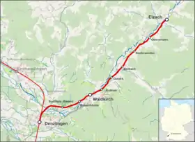The Elz Valley Railway (German: Elztalbahn) is a 19.3 km (12.0 mi) long, single-tracked, standard gauge branch line in the Black Forest area of the German state of Baden-Württemberg. The line branches off the Freiburg im Breisgau to Offenburg section of the Rhine Valley Railway at Denzlingen and runs up the valley of the River Elz to Waldkirch and Elzach.[1]