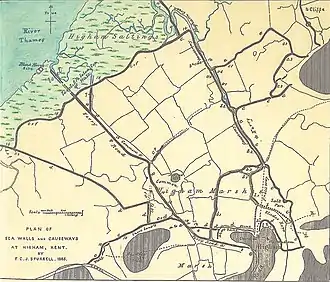 As a specimen[69] of his maps, Spurrell published the one shown here. It had a network of walls enclosing reclaimed marshland near Higham, Kent. The highest walls were the current tidal defences; progressively lower walls lay inland and were (he said) the old defences. The Thames at high spring tides continued to deposit mud on the Saltings but of course not on the landside areas; these were now lower. This was an instance of land reclamation by successive 'inning' of marshland (see below).[70]