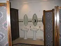 Designed in the classical style, the interior of the Embassy Theatre includes a marble staircase with brass fittings, tiled walls and floors, and dark wooden fixtures.[7] Many of the furnishings reflect the overall style, which even carries into the design of the restrooms, which mirror the tiling with and dark wooden fixtures found elsewhere in the theatre. The theatre has three screens, the largest of which is thought to be one of the largest in the Southern Hemisphere.[10] Other amenities include a snack bar and Blondini's Cafe and Jazz Lounge, which provides a wide selection of food and drink options in addition hosting live jazz music.[11] The ground floor also contains the Black Sparrow cocktail bar and two smaller cinemas.