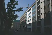The embassy has approximately 250 employees and is one of France's largest.[12] The present embassy building was designed by Christian de Portzamparc, who won the 1997 competition for the commission after German reunification and the decision to return the government of the Federal Republic of Germany to Berlin from Bonn.[13][14] It is substantially on the original site, but the northern portion was exchanged in a land swap for a piece of land on Wilhelmstraße.[13] The public entrance is on this eastern side of the building, leading to the consular and informational section; private entrances for staff and official visitors on Pariser Platz lead to the western section which includes the official reception areas and the ambassador's residence on the top floor.[13][15] An auditorium and meeting rooms are in the centre of the building.[15] The eastern section includes a public sculpture courtyard, with one bronze showing damage from having previously stood in the old embassy building; there is a private garden on an upper level in the western section, overlooked by a line of birch trees from the Himalayas.[13][14][15][16] The Recouverte, the two-storey-high passage through the building between Pariser Platz and Wilhelmstraße, was intended to be open to the public, and is paved like the pavement outside to encourage visitors, but is closed for security reasons.[12][13][17][18][19][20][21] The interior decoration is by the architect's wife, Elizabeth de Portzamparc, with art deco touches in the ambassadorial residence.[19][22]
