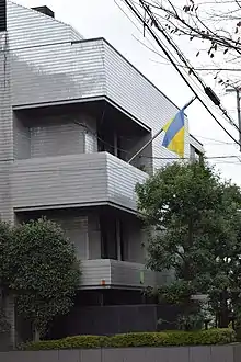 The Embassy of Ukraine in Japan (Japanese:: 日 ウ ク ラ イ ナ 大使館, IPA: [d͡zai̯nit͡ɕi ukuɾa.ina tai̯ɕi̥kaɴ]) is the official representative office of Ukraine in Japan. Located in the prestigious Minato district of Tokyo, where the embassies of most foreign countries in Japan are. Registered in September 1994. It was opened on March 23, 1995, with the participation of the Minister for Foreign Affairs of Ukraine Hennadiy Udovenko during the official visit of the President of Ukraine Leonid Kuchma to Japan. It is headed by an extraordinary and plenipotentiary ambassador.