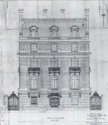 Clarence Moore, a coal magnate from West Virginia and member of private clubs in Paris and New York City, chose the New York City-based architect Bruce Price and the Washington-based Jules Henri de Sibour to design his home in Washington, D.C.[7] At the time, Sibour was a prominent architect of large residences in Washington, including the Thomas T. Gaff House, Andrew Mellon Building, and the ambassadors' residences of Portugal, France, and Luxembourg.[8] Moore purchased the land from Edward J. Stellwagen for $37,422, and construction began in September 1906 and was completed in 1909.[9][10] Moore only lived in the house for three years. On April 15, 1912, Moore was one of the 1,517 passengers who perished during the sinking of the RMS Titanic.[11][12] After Moore's death, his widow, Mabelle, remarried and only used the home for diplomatic and social events.[9]