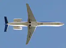 In March 1991, a revised configuration started wind tunnel testing: the quarter chord wing sweep increased to 22.3° with underslung engines for lower aerodynamic drag. This reduced the span by almost 2 to 20.5 m (6 ft 7 in to 67 ft 3 in), reducing its aspect ratio from 9.3 to 8.4 and wing area from 50 to 47 m2 (540 to 510 sq ft). The semi-monocoque wing has two main and one auxiliary spar and holds 4,500 kg (9,900 lb) of fuel, it has double-slotted fowler flaps and spoilers. To accommodate the underwing engines, the landing gear is longer, allowing using jetways, and the fuselage was lengthened from 25.8 to 26 m (85 to 85 ft).[12]
