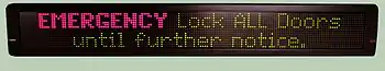 - LED electronic signs use light-emitting diodes to display messages when connected over a network to an emergency communication system. LED signs, when deployed in large numbers on a network, can be used as visual alternatives to traditional audio public address systems. LED Signs are able to communicate effectively in loud environments where audio PA systems can be ineffective. When deciding whether or not to include LED electronic signs as part of an emergency communication system, it is important to realize that a lack of hearing-impaired persons does not negate the need for visual signs. Explosions and other events can render many hearing-able people effectively deaf, necessitating the inclusion of a visual alternative to audio PA systems. LED electronic signs have multiple valuable attributes that enhance public communications: