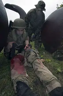 Emergency tourniquets are cuff-like devices designed to stop severe traumatic bleeding before or during transport to a care facility. They are wrapped around the limb, proximal to the site of trauma, and tightened until all blood vessels underneath are occluded. The design and construction of emergency tourniquets allows quick application by first aid responders or the injured persons themselves.[1] Correct use of tourniquet devices has been shown to save lives under austere conditions with comparatively low risk of injury. In field trials, prompt application of emergency tourniquets before the patient goes into shock are associated with higher survival rates than any other scenario where tourniquets were used later or not at all.[2][3]