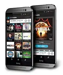 The NextRadio smartphone app was developed by Emmis, with support from the National Association of Broadcasters, to enable FM radio reception on mobile devices with activated internal FM receivers.[45] NextRadio allows users of many FM-enabled smartphones to listen to broadcast FM radio—with no need for Internet connection or use of phone data—and receive supplemental data such as album art, program information, and metadata over the Internet if connected.[46][47] Launched in August 2013 through a radio industry agreement with Sprint Corporation,[48] the app was preloaded on some devices, and available for download in the Google Play Store of Android applications.[49]