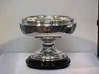 The original All Japan Championship Tournament trophy was awarded to the JFA by the English Football Association in 1919. This trophy was used until January 1945, when the militarist government confiscated it and melted down to procure additional metal for the war effort.[7] When the tournament was reinstated, the present trophy, showing the Imperial chrysanthemum seal began to be awarded.