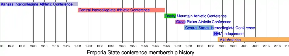Emporia State University began its athletic life as a member of the Kansas Intercollegiate Athletic Conference from 1893 to 1928.[11] Emporia State, along with other schools from the conference, withdrew from the KIAC and formed the Central Intercollegiate Athletic Conference in 1928, where it stayed as a member for thirty-nine years.[12] After competing the CIAC for almost four decades, Emporia State left the CIAC and joined the Rocky Mountain Athletic Conference in 1967.[13] In 1972, the RMAC split into two conferences, one keeping the current name and the other to be called Great Plains Athletic Conference, and four years later formed the Central States Intercollegiate Conference.[14] In 1989, the CSIC disbanded and Emporia State became an Independent.[15] In 1991, Emporia State became an NCAA Division II member and joined the Mid-America Intercollegiate Athletics Association, where it remains a member today.[16]
