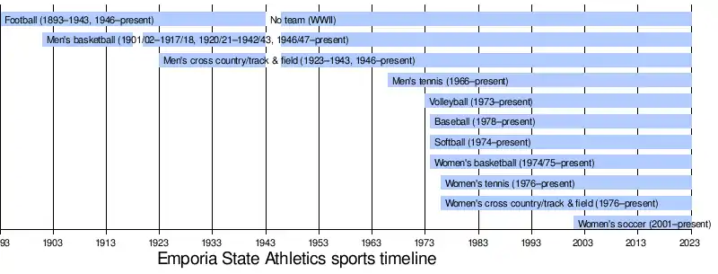 Emporia State has been a member of six conferences and two stints as an independent, since its athletics beginnings in 1893.[10]