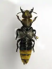 Emus is a genus of rove beetles with long, matted yellow, black, and grey hairs on the pronotum and parts of the abdomen.[3]