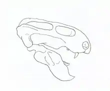 Both species of Emydops are small. The skull of Emydops was 5 cm (2 in) long. Tusks are present in most skulls, but some lack them. The eye sockets are positioned far forward in the skull and face somewhat forward and upward. A wide area on the lower jaw called the lateral dentary shelf is another distinguishing feature of the genus.[1] The temporal regions behind the eyes are large, and the back of the skull is wide and square-shaped. The holotype specimen of E. oweni is unusual in that it has two pairs of tusks. The second pair of tusks is not seen in any other dicynodont, and is a feature unique to the specimen. The extra tusks are considered a pathological feature; they are thought to have been the result of a mutation in the individual and are not considered a defining characteristic of the species.[2]