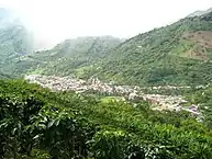 In 2018, Rendon and Osma accompanied Howard, Bush, and Miranda on a research trip to Colombia.[18] During their two weeks in the country,[20] they met with architects, chefs, and artisans to immerse themselves in the country's culture.[26] They also visited the Gabriel García Márquez foundation.[26] They visited big cities like Bogotá and Cartagena, but they found inspiration in small towns such as Salento (terrain) and Barichara (architecture).[26] Bush noticed that "every town we went to had a very specific personality", because of how the country's mountainous terrain divides and isolates them.[20] According to Disney fan club publication Disney twenty-three, this isolation became the key to placing the Madrigals' residence in a "remote 'encanto'—that is, a place that's 'charmed,' or spiritually blessed, a domain where magic and reality merge".[20] As Colombian tourist guide Alejandra Espinosa Uribe explained, Colombians are surrounded by "sacred lands that feel magical, and we coexist with them, not questioning their existence".[23]: 30 In Barichara, they befriended Espinosa Uribe, who showed them around the town, and later hired her to consult on the film's historical and cultural authenticity.[27] Espinosa Uribe was an inspiration for several aspects of the film's protagonist Mirabel, including her curly black hair, large eyeglasses, and gestures.[27] The design of Mirabel's skirt was inspired by traditional skirts woven in the Vélez area.[27]