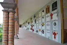 The Señor de la Misericordia Cemetery is the oldest in the Los Altos region. Its construction was begun in 1826 as a patio surrounded by four corridors lined with crypts. In the centre, there is a large chapel made of white sandstone. The facade of this chapel has three arches and decorated with vegetative motifs and some animal figures. The interior contains a mural of a crucified Christ with Byzantine influence, called the Señor de la Misericordia (Lord of Mercy). It was painted by Pablo Contreras in 1833.[1] Many of the graves are not underground but rather above-ground crypts. The old section is almost entirely of crypts. This form of interment and the dry climate of the area has produced a number of naturally occurring mummies, similar to those found in Guanajuato.[3]