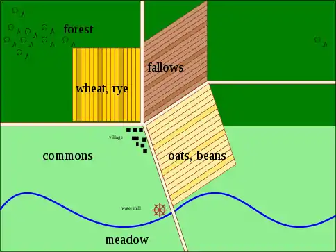 The very nature of the three field rotation system imposed a discipline on lord and tenants in their management of the arable land. Every one had the freedom to do what they liked with their own land but had to follow the rhythms of the rotation system.[33] The land-holding tenants had livestock, including sheep, pigs, cattle, horses, oxen, and poultry, and after harvest, the fields became 'common' so they could graze animals on that land.[34] [35] There are still examples of villages that use the open field system, one example being Laxton, Nottinghamshire.[26]