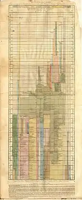 In the second edition, the article "History" was written by Adam Ferguson[10] and/or Tytler.[11] Folded into the article there is a plate, colored by hand, showing a timeline of history. It begins at the flood of Noah and numbers the years from the creation of the world, giving the birth of Christ the year 4004, and it includes timelines for different regions of the world. Ferguson explains the chart at the bottom.