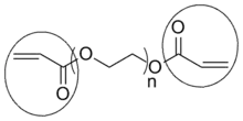 End groups are an important aspect of polymer synthesis and characterization. In polymer chemistry, end groups are functionalities or constitutional units that are at the extremity of a macromolecule or oligomer (IUPAC).[1] In polymer synthesis, like condensation polymerization and free-radical types of polymerization, end-groups are commonly used and can be analyzed for example by nuclear magnetic resonance (NMR) to determine the average length of the polymer. Other methods for characterization of polymers where end-groups are used are mass spectrometry and vibrational spectrometry, like infrared and Raman spectrometry. Not only are these groups important for the analysis of the polymer, but they are also useful for grafting to and from a polymer chain to create a new copolymer. One example of an end group is in the polymer poly(ethylene glycol) diacrylate where the end-groups are circled.
