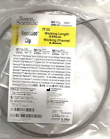 The endoclip was first described by Hayashi and Kudoh in 1975,[1] and was termed the "staunch clip". Initial attempts to incorporate the clip into applications in endoscopy (such as clipping bleeding blood vessels) were limited by the applicator system of the clip.[1] However, by 1988, an easy to use applicator delivery system was developed, and a functional reloadable endoclip system was described.[2] This consisted of a stainless steel clip (of size approximately 6 mm long and 1.2 mm wide at the prongs) with a metal deployment device (that could be used to insert the clip into the endoscopic camera, and deployed outside the camera) enclosed in a plastic sheath.[1] These clips were initially reloadable.