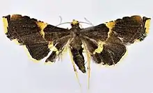 The wingspan is about 21 mm. The forewings are blackish brown in males and black in females. The hindwings are black.