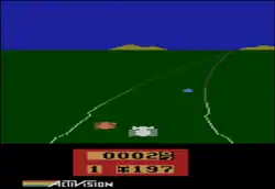 Enduro is a racing video game designed by Larry Miller for the Atari 2600 and published by Activision in 1983. Miller previously wrote Spider Fighter for Activision.[1] The object of the game is to complete an endurance race, passing a certain number of cars each day to continue the next day. The visuals change from day to night, and there is occasional inclement weather. A ZX Spectrum port was published in 1984