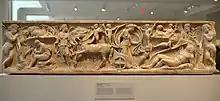 The mytheme of Endymion being not dead but endlessly asleep, which was proverbial (the proverb—Endymionis somnum dormire, "to sleep the sleep of Endymion")[18] ensured that scenes of Endymion and Selene were popular subjects for sculpted sarcophagi in Late Antiquity, when after-death existence began to be a heightened concern. The Louvre example, discovered at Saint-Médard-d'Eyrans, France (illustration above), is one of this class.