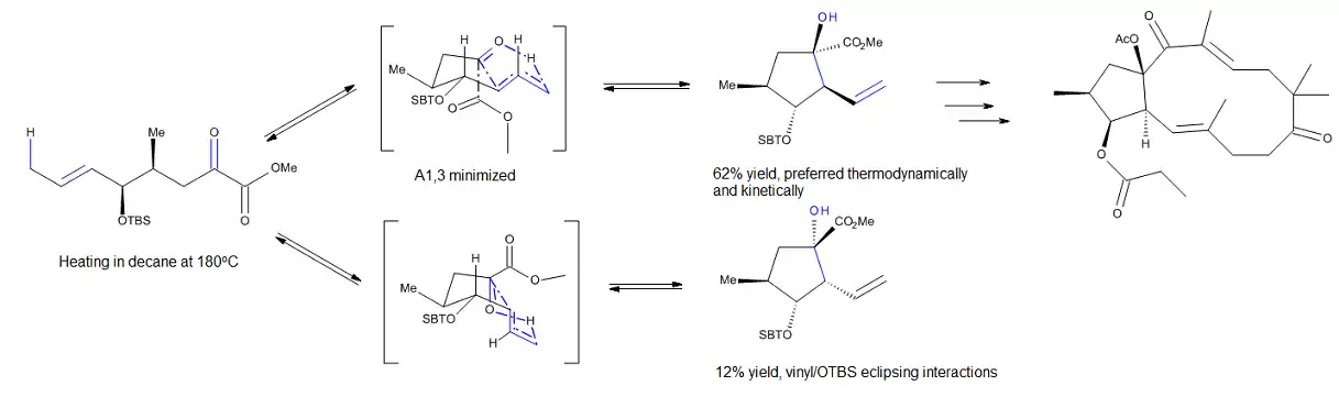 Intramolecular ene reactions benefit from less negative entropies of activation than their intermolecular counterparts, so are usually more facile, occurring even in the case of simple enophiles, such as unactivated alkenes and alkynes.[13] The high regio- and stereoselectivities that can be obtained in these reactions can offer considerable control in the synthesis of intricate ring systems.
