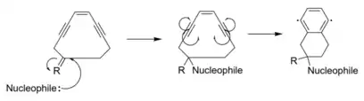 Myers-Saito cyclization is another triggering mechanism by which an enediyne warhead becomes a diradical. This mechanism requires the alkene of the enediyne to be part of a diene with a double bond in a variable group. A nucleophile will attack the double bond in the variable region, causing a chain reaction of electron pushing. Ultimately, one of the triple bonds of the enediyne is converted to a cumulene.[2] The cumulene and the remaining alkyne donate one electron each to form a new covalent bond.