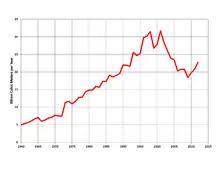 The main electricity source is hydropower, which accounts for 71% in 2004.[10] A gross theoretical capability of hydropower is 320 TWh per annum, of which 130 TWh per annum is considered as economically feasible.[14] In 2004, Venezuela produced 70 TWh of hydropower, which accounts 2.5% of world's total.[10] At the end of 2002, total installed hydroelectric generating capacity accounted 13.76 GW with additional 4.5 GW under construction and 7.4 GW of planned capacity.[14]