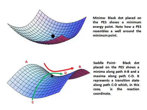 Saddle point represents a maximum along only one direction (that of the reaction coordinate) and is a minimum along all other directions. In other words, a saddle point represents a transition state along the reaction coordinate. Mathematically, a saddle point occurs when